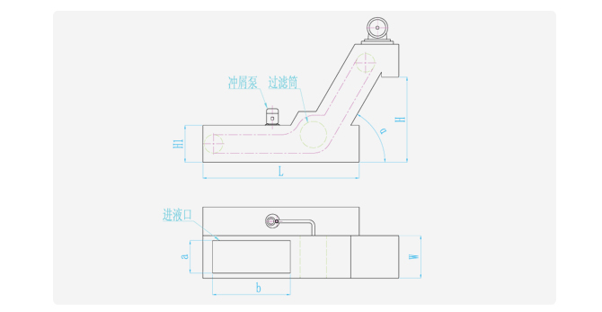 當機床切屑隨著冷卻液進入本裝置時,較大的切屑沉到機器底部由刮屑板刮出,細小顆;煸诶鋮s液中,隨著冷卻液通過旋轉過濾筒過濾器時,堵塞在過濾筒外的過濾網上。由于過濾筒過濾器是不斷旋轉的,堵塞在過濾網上的細小顆粒經過反沖清洗系統的沖洗落到機器底部也由刮屑板刮出。同時經過過濾的冷卻液流入凈液箱,再由液泵泵到主機上。
